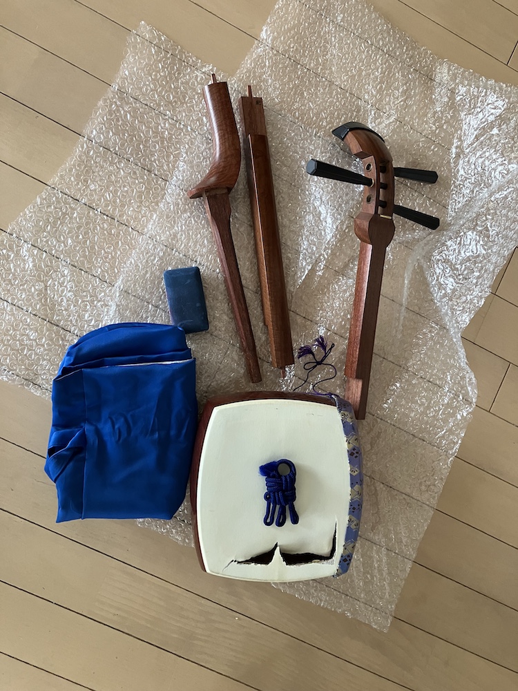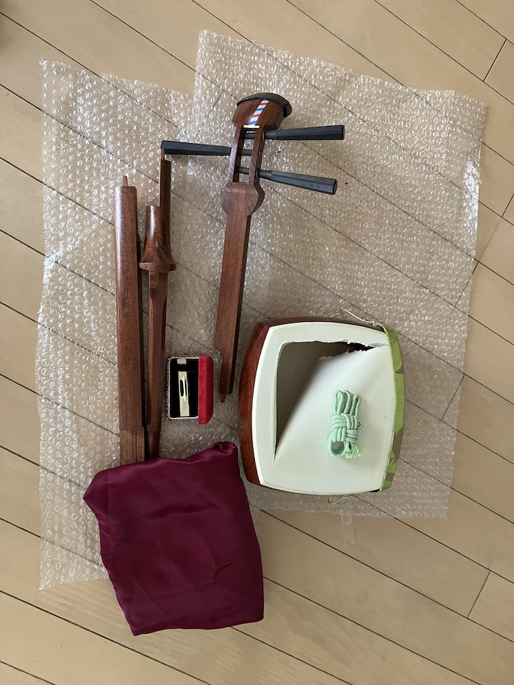 いろいろ考えた結果、三味線は袋から出し、コンパクトに分解して運ぶことにしました。重いことには変わりありませんが、棹の長さがない分、これならなんとか持ち歩くことができるかと。