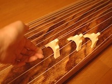 琴柱は可動式の駒で普段は取り外しておき、演奏する時に1弦ずつ立てていきます。